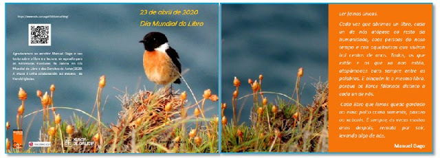 Nesta ocasión o escritor, xornalista e divulgador da cultura de Galicia, Manuel Gago, creou un texto orixinal cedido xenerosamente para esta pequena peza de difusión do Día do Libro, centrándose nas potencialidades do libro e da lectura e que nos agasalla esta evocadora afirmación: